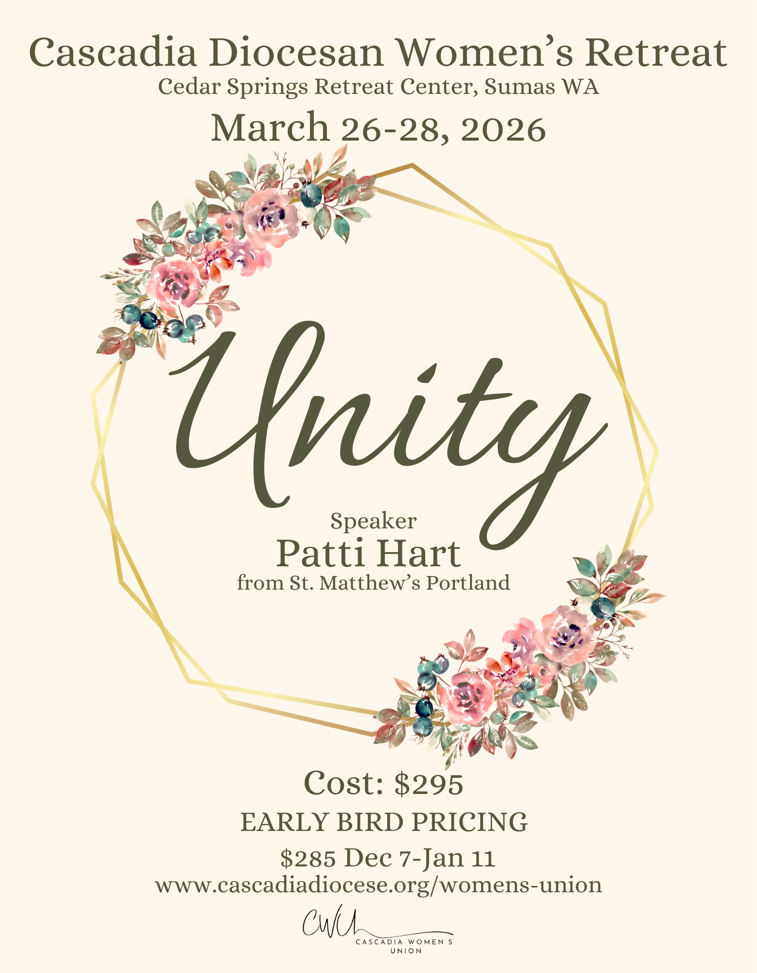 Join us for our annual 2026 Cascadia Womens Retreat! It will be held at Cedar Springs in Sumas, WA from Thursday March 26 to Saturday March 28.